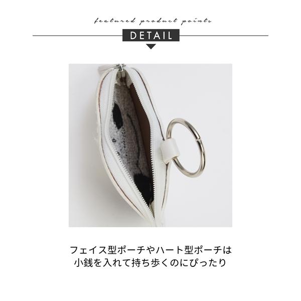 【素材】材質=合成皮革・合成繊維 サイズ=【バッグ型ポーチ】たて約8×よこ約11×まち幅約4cm 取り外し可【ハート型ポーチ】たて約8×よこ約9.5cm 取り外し可【フェイス型ポーチ】たて約7×よこ約10cm 取り外し可 開閉=ファスナー コードの長さ=約34cm 取り外し可 重量=約126g