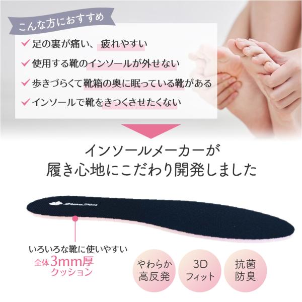 【こんな方におすすめ】足の裏が痛い、疲れやすい、使用する靴のインソールが外せない、インソールで靴をきつくさせたくない
