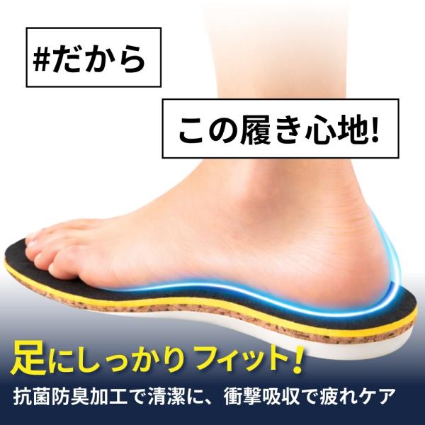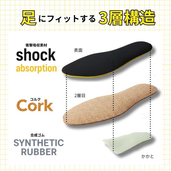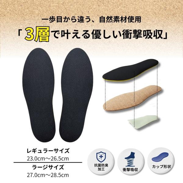 衝撃吸収生地+コルク生地+カップ型の3層構造インソール!