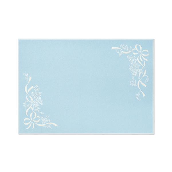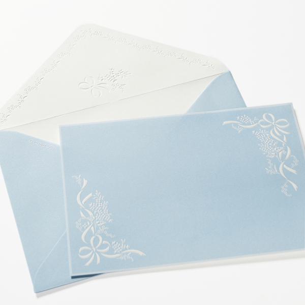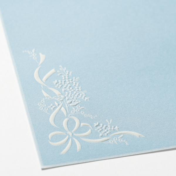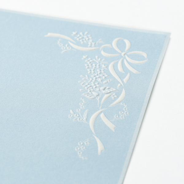 “絆”を象徴するリボンと小花を組合わせ、浮出し加工を施したエレガントなデザインです。