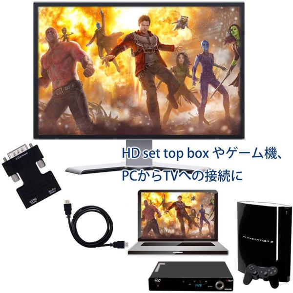 本製品はHDMIからVGAへの変換アダプタです。これを使うだけで、簡単にパソコンに保存してある映像をVGA対応のPCに映し出せます。