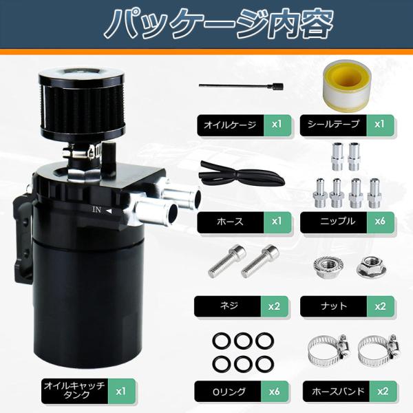【パッケージ内容】オイルキャッチタンク*1、φ10mmニップル*2、φ13mmニップル*2、φ16mmニップル*2、ホース*1、ホースバンド*2、Оリング*6、スチールウール*1、シールテープ*1