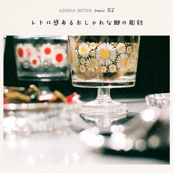 アデリアレトロの脚付きグラスシリーズは、特徴的で短い脚部が付いているのが特徴。また、台座の周囲はギザギザデザインで昭和感満載のデザインとなっております。