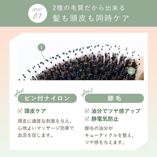 【 毛質(2) 豚毛 】★ツヤ感アップ&静電気防止:豚毛の油分が、キューティクルを整えツヤ感を与えます。