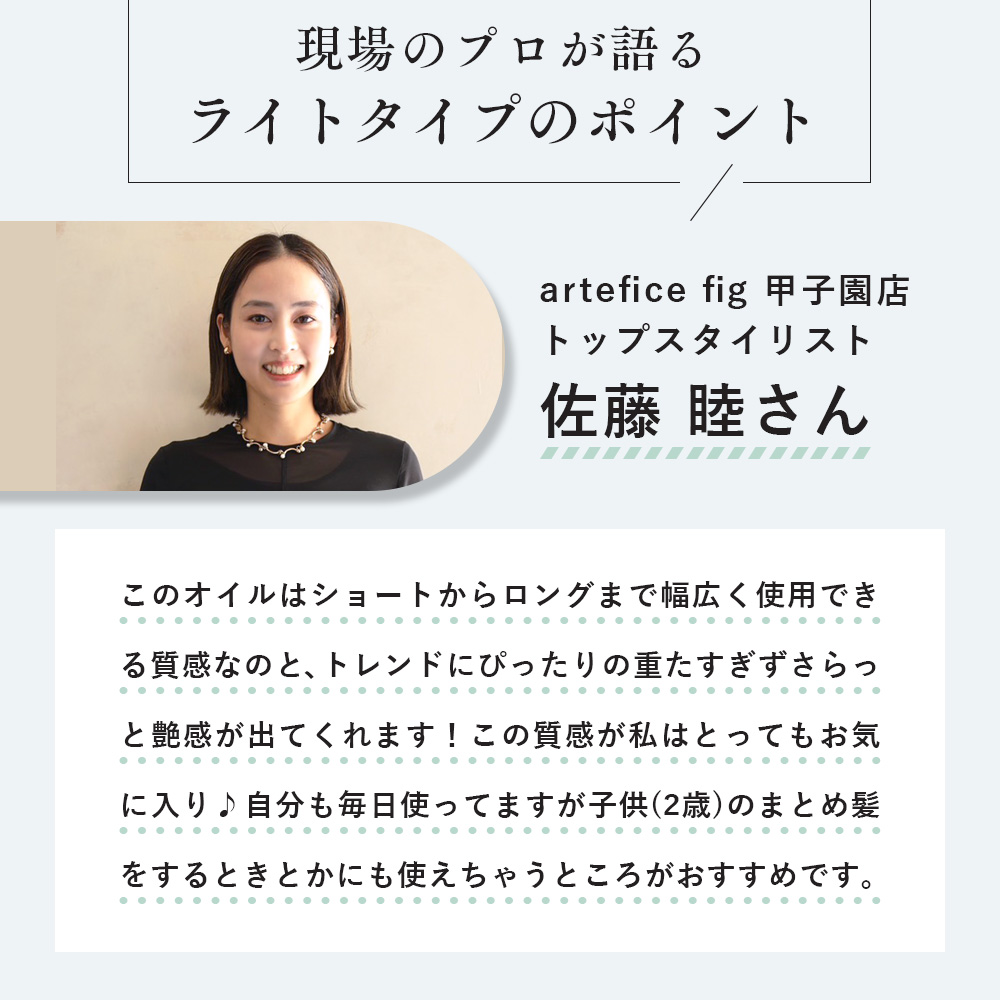 【 髪にも肌にもやさしく 】オーガニックな成分*を配合し、「保湿&ツヤ&まとまり」を実現!スタイリング後、手に残ったオイルはボディケアとしても使用できます。 *オリーブ果皮油・アルガンオイル・シア脂