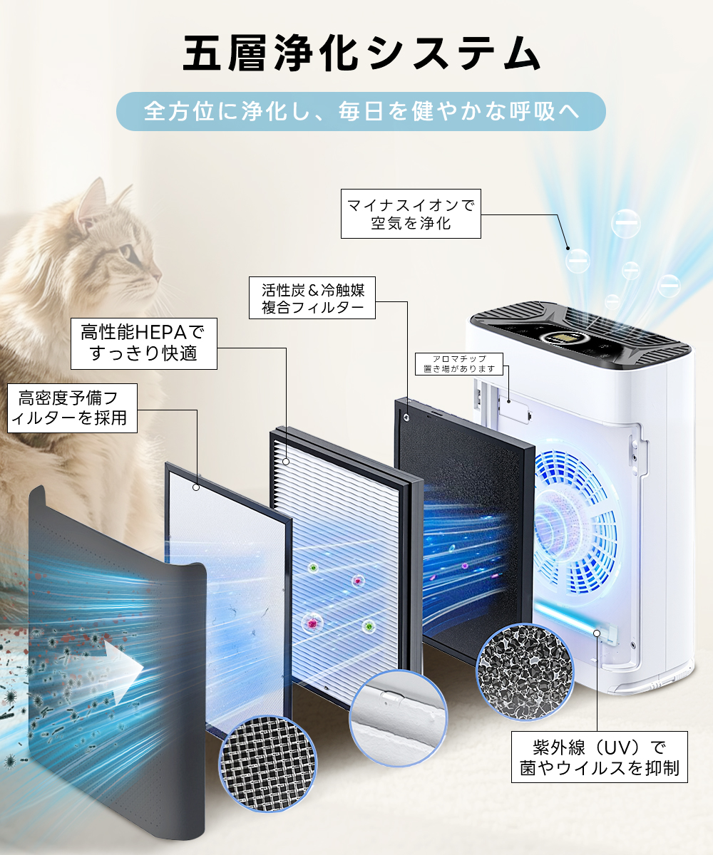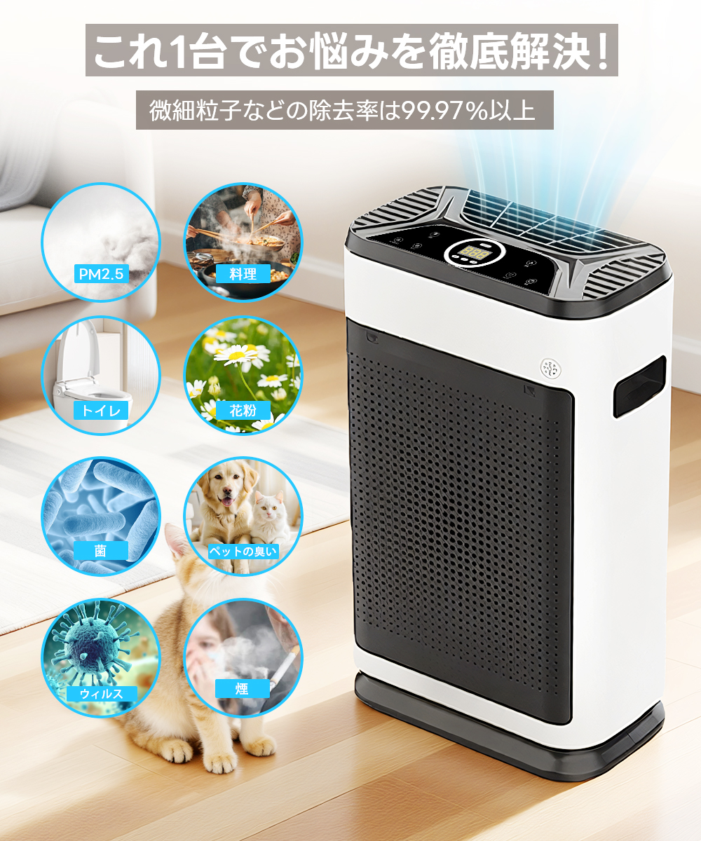 花粉、PM2.5、ウイルス、アレルゲンを99.97%以上キャッチ。目に見えない微細な粒子やペットのニオイも強力に脱臭・除去します。