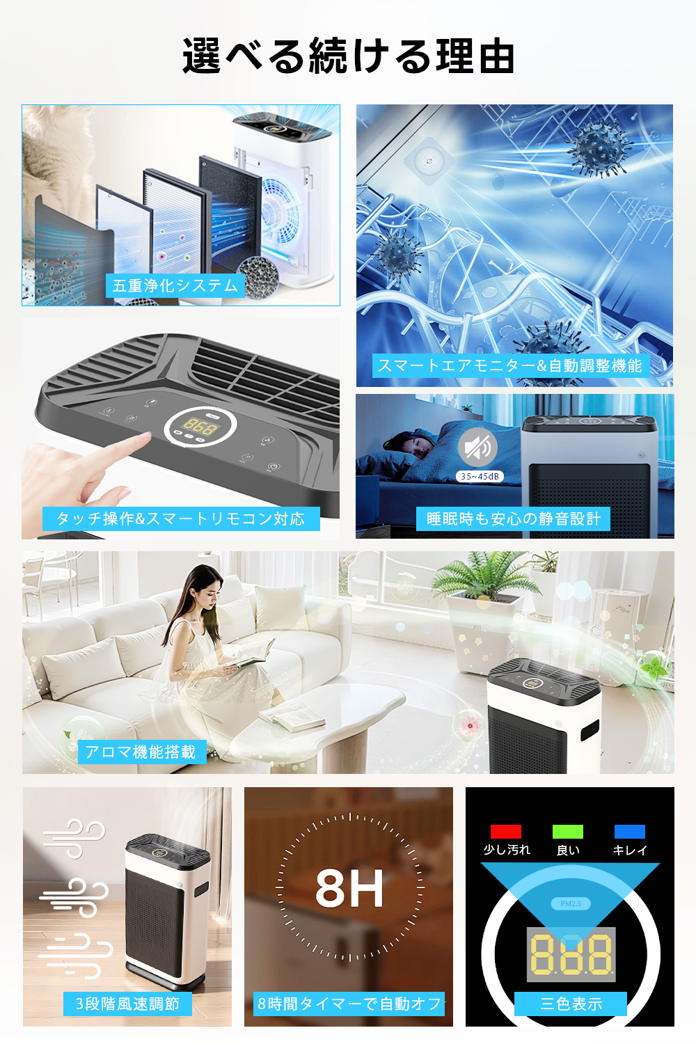 就寝中も気にならない静音モードを搭載。24時間使っても電気代を抑えた家計に優しい設計です。シンプルで洗練されたデザインは、どんなインテリアにも馴染みます。