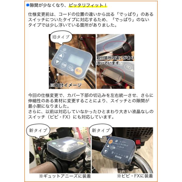 各社電動アシスト自転車のスイッチ部に被せるシリコンカバー。 スイッチ部の破損を防ぎ、浸水によるトラブルを防ぎます。 ※16年・17年 エコナビ液晶スイッチ4/4Sのパナソニック社製子乗せタイプ電動アシスト自転車のスイッチのみに完全に対応しています。ショッピングモデル等のスイッチは若干形が異なり取付は出来ますがぴったりと形状はあいません。全く対応しないモデルもあります。(ビビTX、FX、ライトシリーズなどは15年モデル用をお選びください) ・経年劣化でビニールの被膜が剥がれやすい電動スイッチをしっかり保護します。 ・電動アシスト自転車ご購入時に取付がおすすめ。 パナソニック 対応車種(2016年10月現在) 対応状況◎ ギュットアニーズ ギュットアニーズF ギュットミニEX ギュットミニDX ギュットDX ギュットステージ 対応状況△(取付イメージは写真をご確認下さい) EZ エーガールズ オフタイムカラーズEB グリッター グリッターAハリヤ ビビSXシティ ビビDX ビビスタイルビビEX カラーズEB ビビEXシティビビDXシティ ティモシリーズ BP02