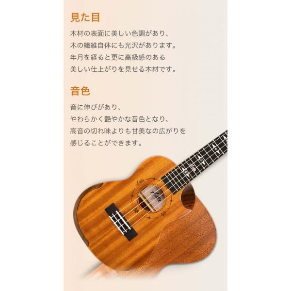 ●上質なマホガニー材で製作・コンター加工を施したコンサートサイズのウクレレです。木材の表面に美しい色調があり、木の繊維自体にも光沢があります。音に伸びがあり、やわらかく艶やかな音色となり、高音の切れ味よりも甘美なの広がりを感じることができます。