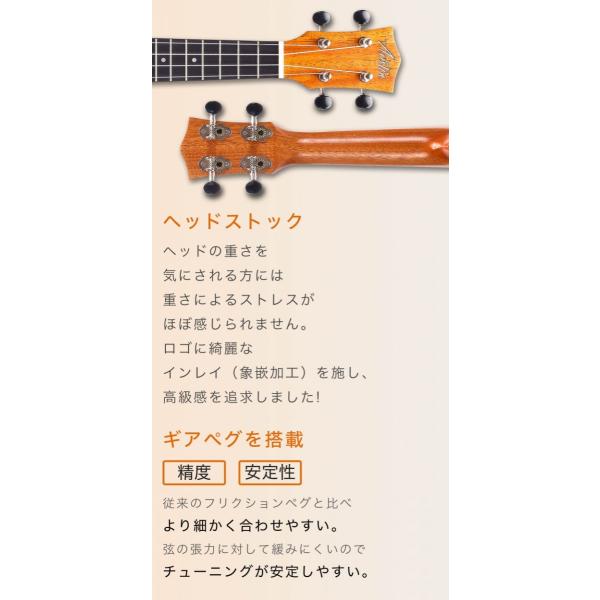 ●弦はイタリア直輸入の高級弦Aquila。従来のフリクションペグと比べ より細かく合わせやすい。弦の張力に対して、チューニングが安定しやすいです。
