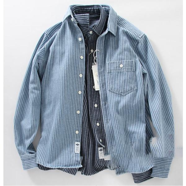 デニムシャツ メンズ 長袖 アメカジ ストライプ カジュアル 開襟 ジャケット ヴィンテージ ウォッシュ加工 ユーズド加工 着痩せ ゆったり おしゃれ