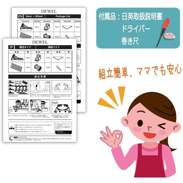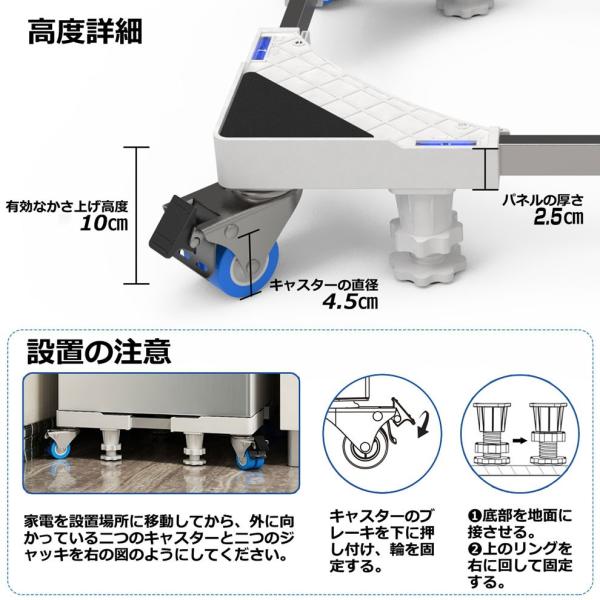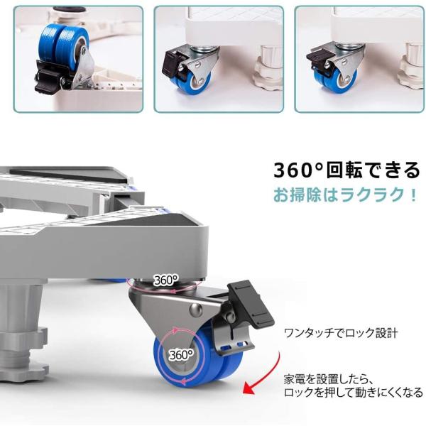 (1)巨大なジャッキ4本と2連の車輪4個と肉厚のステンレス鋼のパイプ8本、360度移動できて耐荷重も500kgまで達すので、より多くの家電製品が対応できます!
