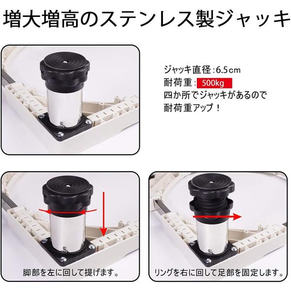 洗濯機台 耐荷重約500kg 増大増高ジャッキ付き 洗濯機置き台 DEWEL 高さ調節可 幅/奥行44.8〜69cm 減音防振 ステインレス製 防振パッド付き