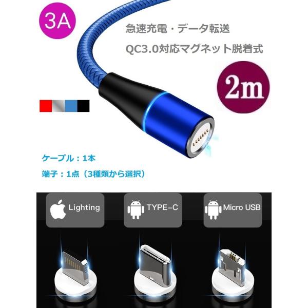 iphone充電器 アイフォン 2Mケーブル+端子1点 強力 磁石式 3A 急速 iPhone(16・17対応) Android microUsb TypeC マグネット 脱着式 防塵 LEDランプ付き
