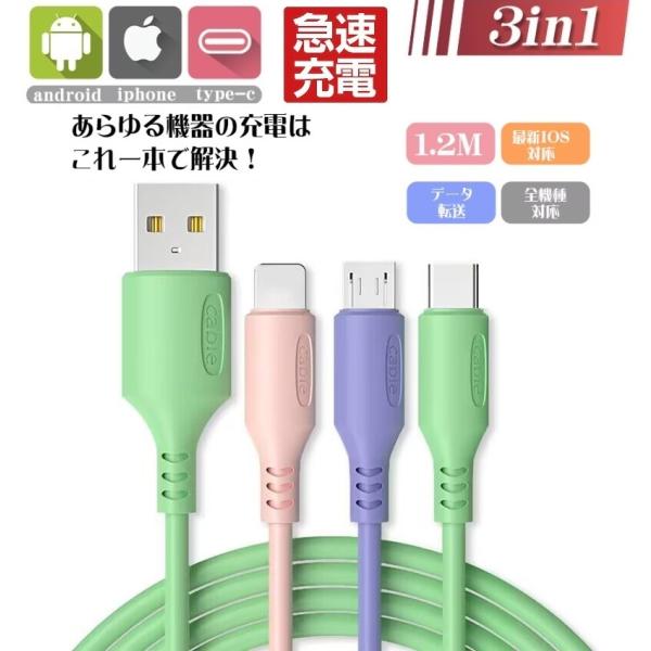 ◆シリコン素材◆ iPhone/Type c/Micro usb ライトニング ケーブル 3in1 充電ケーブル