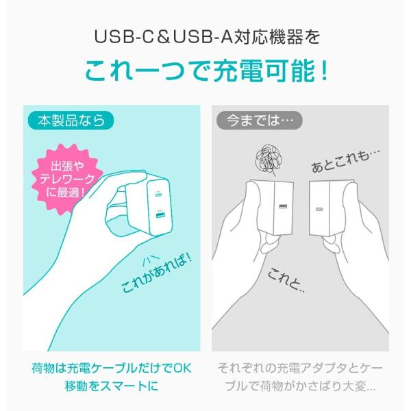 USB Type-AとType-Cの2種類のポートを装備。iPhone、Android、iPadなどにもお使いいただけます。