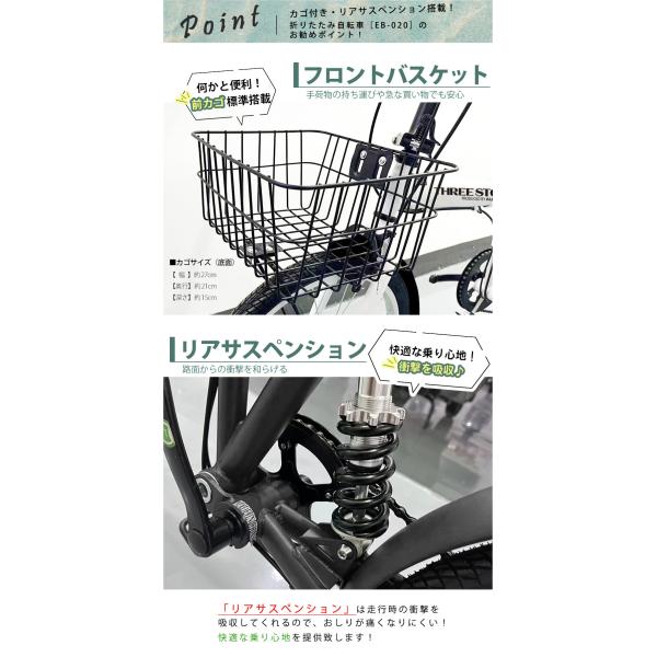 自転車 折りたたみ自転車 20インチ シマノ製 6段ギア リアサスペンション 折り畳み 通勤 通学 お買い物 ワイヤーロック錠 フロントライト 前カゴ [EB-020]