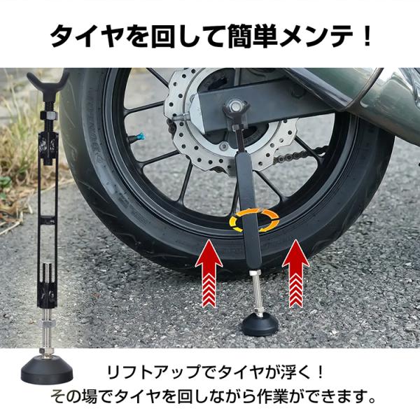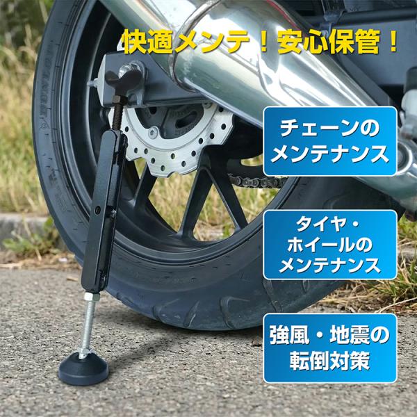 バイク用スタンド メンテナンス リフトアップ 転倒防止 サイドスタンド 地震 防災 災害 高さ調整 強風 チェーン タイヤ 保管 ホイール 滑り止め ブレーキロック 収納袋 リアメンテナンススタンド 後輪スタンド ジャッキアップ チェーン整備 タイヤ交換 耐荷重400kg 敬老の日 父の日 母の日 クリスマス プレゼント ギフト