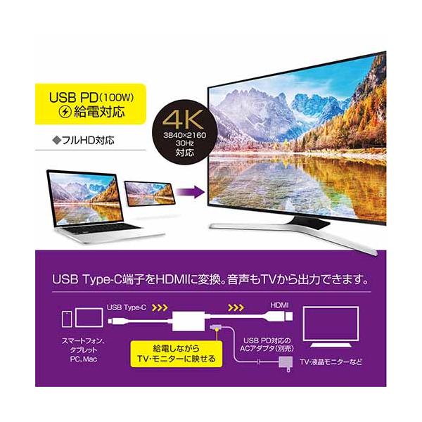 ミヨシ MCO USB Type-C to HDMI変換ケーブル【2.0m】USD-PFH20 高速給電しながら 4K 映像伝送 USB PD 100W充電【送料無料n ポスト投函】Type-C to HDMI Cable