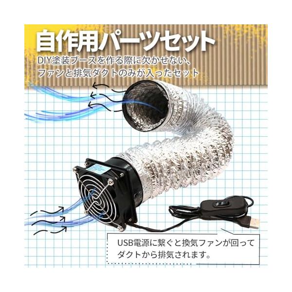 自作用パーツ塗装ブースを自作する際に欠かせないファンと排気ダクトのみが入ったセット。塗装ブースのDIYにお役立て下さい。製作にあたり外装ケースなどが別途必要です。