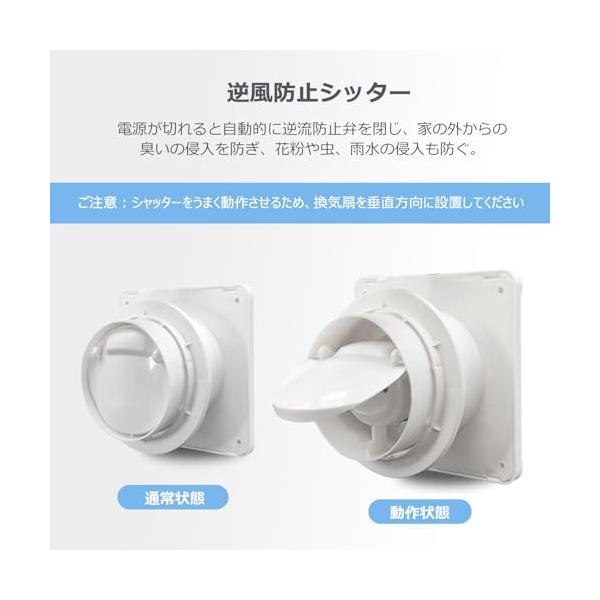 ・逆風防止シャッター逆風防止シャッターが付き、外気の侵入を効果的に防ぎ可能です。ABS素材で、金属の逆風防止シャッターに比べて、自動開閉の騒音を大幅に削減します。その以外、換気扇シャッターが取る外し可能で、さまざまな設置ニーズに対応します。