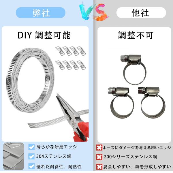 ・サイズ調整が可能:様々なホース径に合わせてスパンレースの長さを調整できます。そしてバンドをカットし、ドライバーでネジを締めたり緩めたりします。