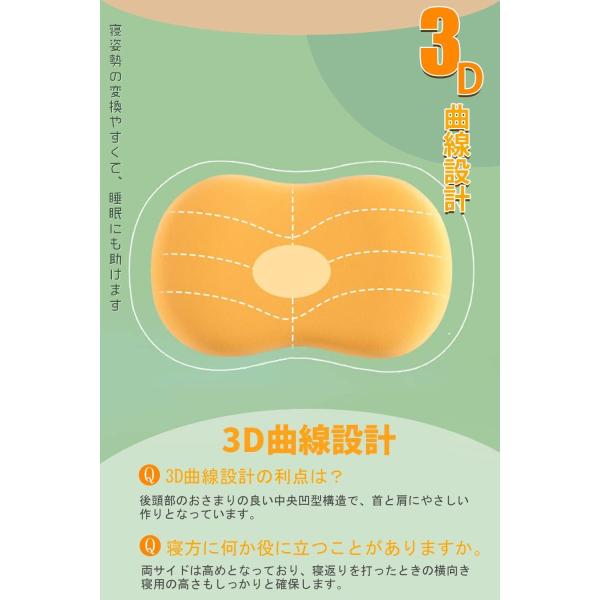 【3D曲線設計】独特な中部は凹型設計となっています。仰向け寝時は、真ん中の伸びた部分が首をしっかりとサポートし、頚椎を理想的な状態に保ちます。横向き寝時は、高くなっている両側が耳や肩を圧迫せずに背中の筋肉がいい感じで緩むため、体の負担を軽減してくれます