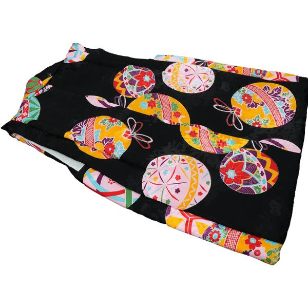黒地に描かれた色とりどりの「手まり柄」は、丸く収まる・幸せを呼び込む