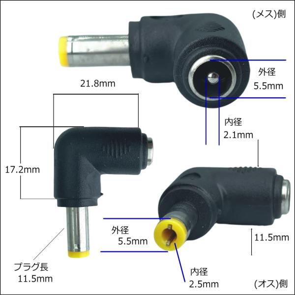 DC変換L型アダプタ アダプター コネクタ コネクター 外径5.5mm 内径2.5mm メス オス 5525-L