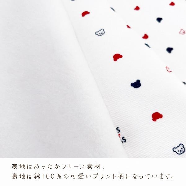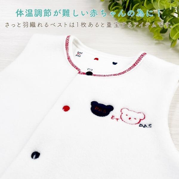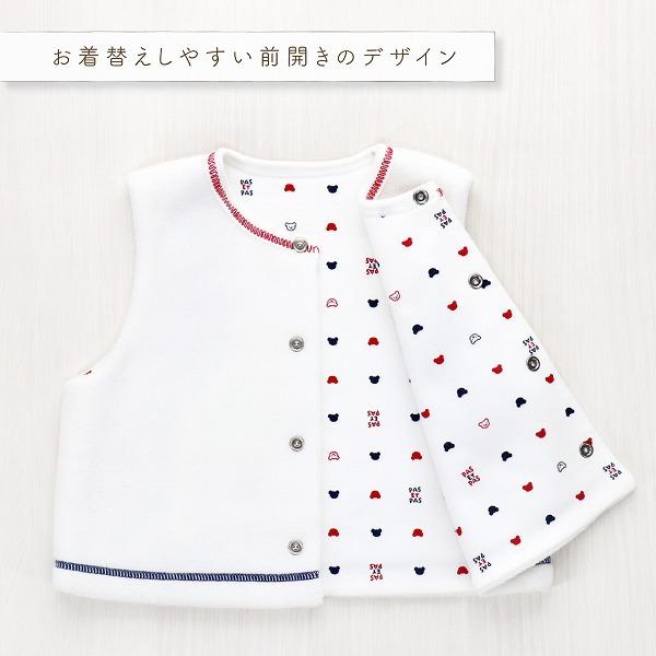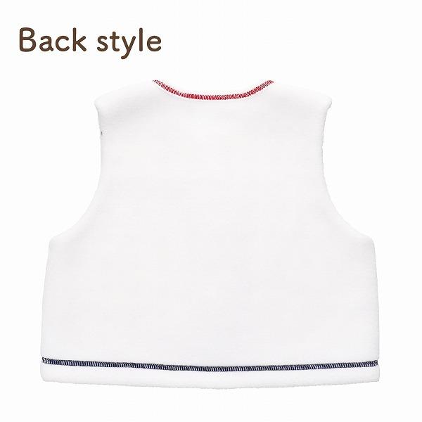 赤と紺のトリコロールカラーのくまさんがついた、シンプルでおしゃれなベストです。フリースとスムースの2枚合わせになっているので、軽いのにとってもあったか、手軽に羽織れるベストは、お外でも室内でも、赤ちゃんの体温調節にとても便利なアイテムです。