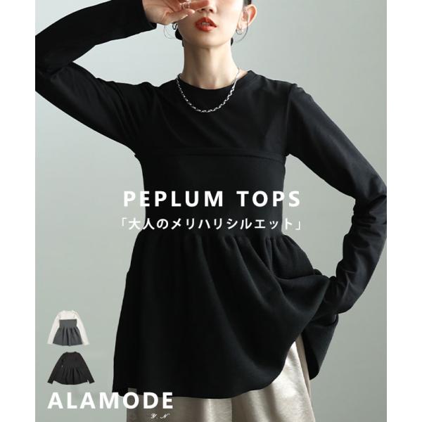 爆買 レディース トップス 異素材 カットソー ニット ペプラム フレア 長袖 ブラック オフホワイト 大人可愛い 大人 可愛い 30代 40代 50代 60代 サワアラモー