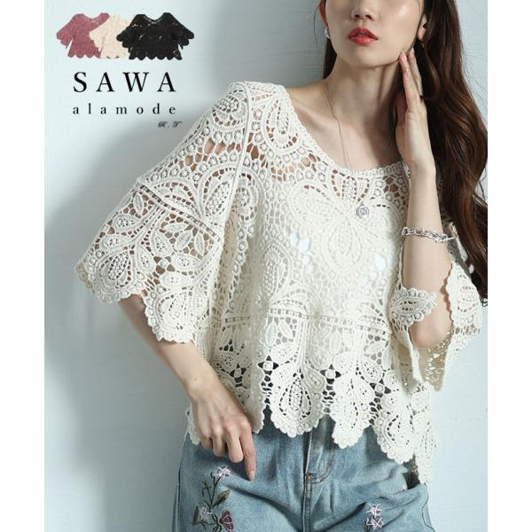 トップス シャツ カットソー ブラウス 刺繍 花 透け感 綿 コットン ベージュ 春 夏 秋 レディース レディス サワアラモード 洋服 30代 40代 50代 60代