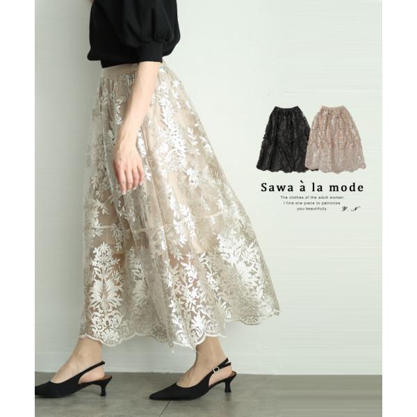 レディース ボトムス スカート ブラック 黒 シルバー ミモレ丈 刺繍 ボタニカル 花柄 チュール 春 大人可愛い 大人 可愛い 30代 40代 50代 60代 サワアラモード