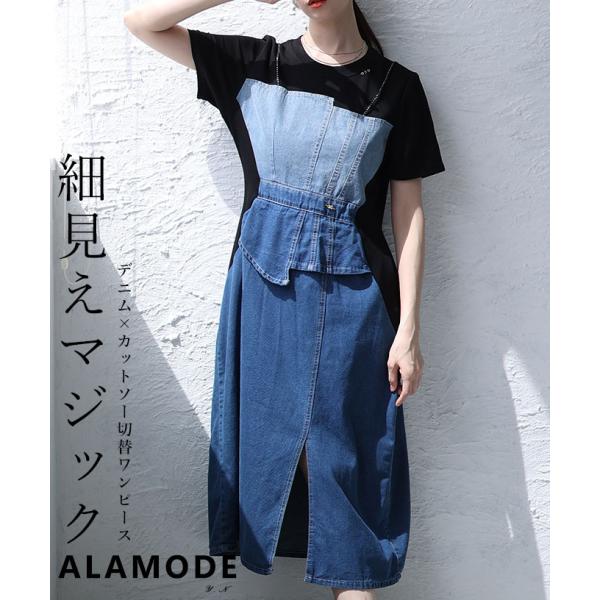ワンピース レディース 異素材 デニム カットソー アシンメトリー スリット 半袖 ミモレ ブルー 大人可愛い 大人 可愛い 30代 40代 50代 60代 サワアラモード