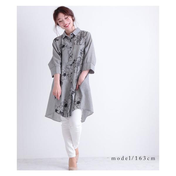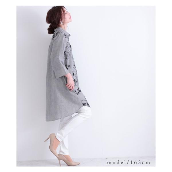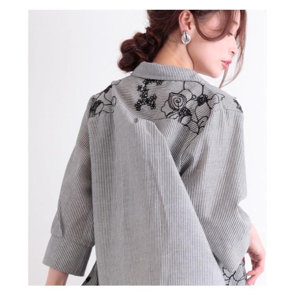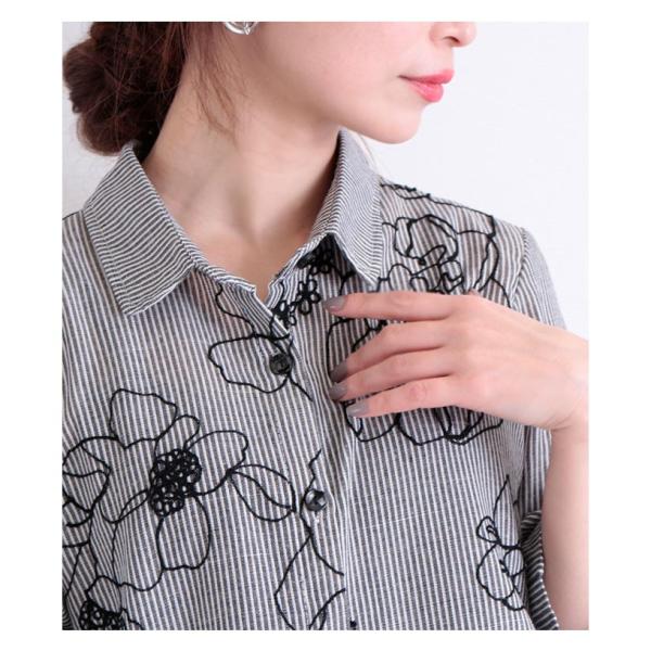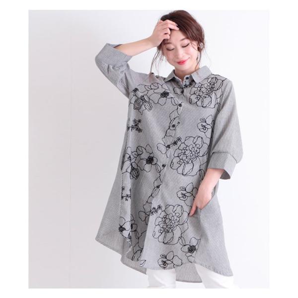 ストライプ柄花刺繍シャツチュニック ブラック リネン コットン トップス ロング丈 レディース レディス サワアラモード 大人 可愛い 洋服 30代 40代 50代 60代
