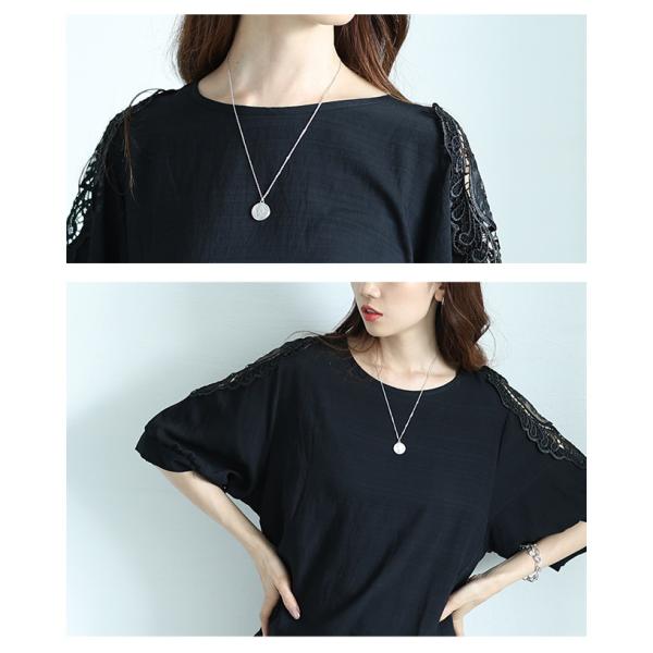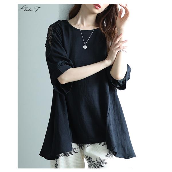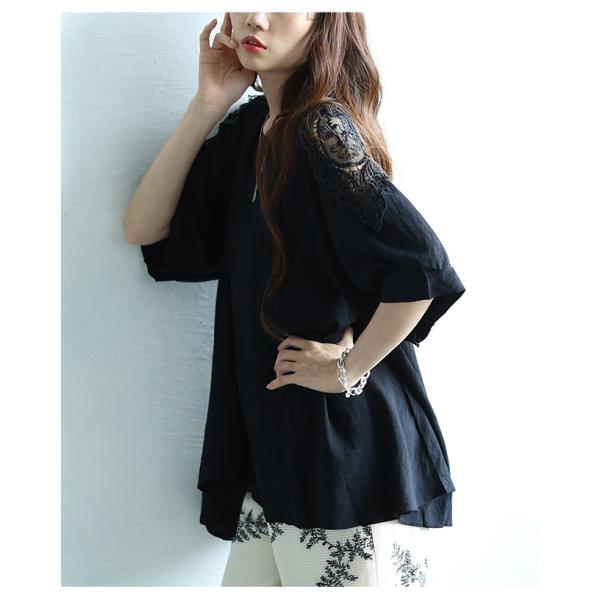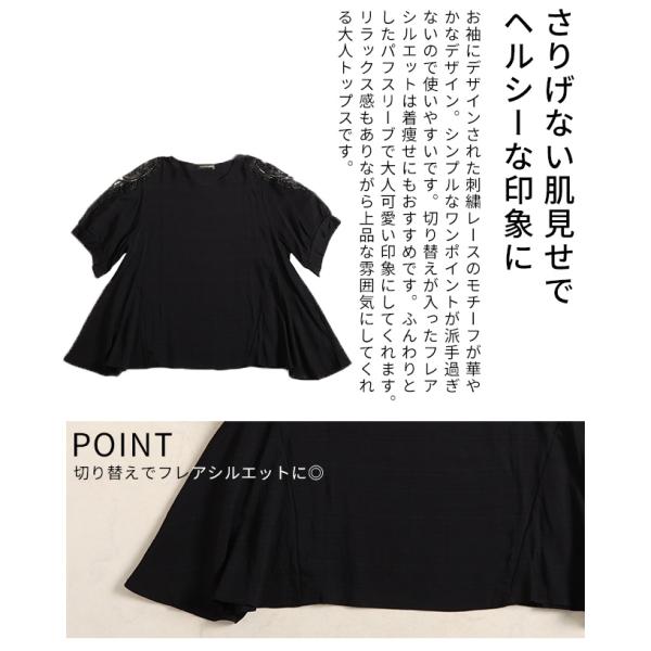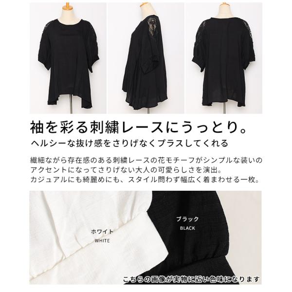 レディース チュニック トップス 黒 ブラック 白 ホワイト 5分袖 刺繍 レース パフスリーブ フレア 大人可愛い 大人 可愛い 30代 40代 50代 60代 サワアラモード