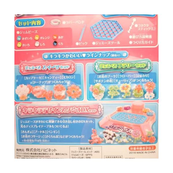 セット内容:ジェムビーズ(みずいろ、オレンジ、あか、きいろ、しろ、くろ)、ラバーバンド、ピック、ジェミーズツール、コネクタスティック(L)、遊び方説明書、つくり方ガイド