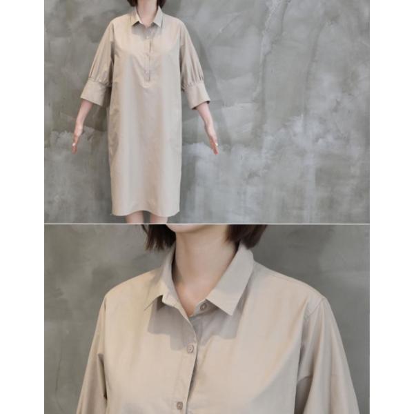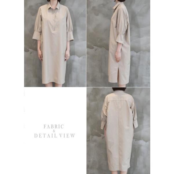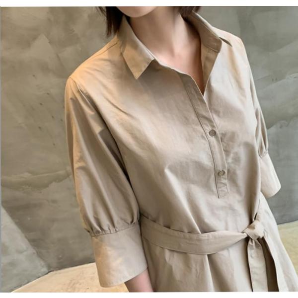 バルーン袖 ハーフオープンシャツ ワンピース 紐ベルト付き 七分袖 スリット 無地 春秋 ミセス
