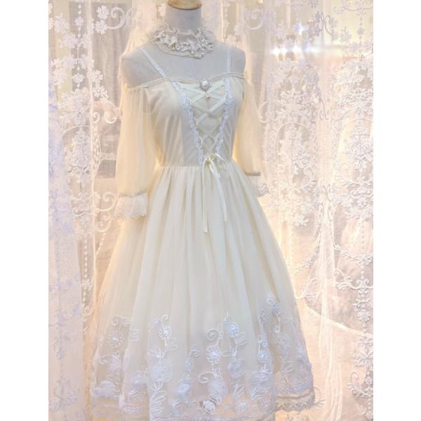 新作 ワンピース ゴスロリ クラロリ 春夏秋 長袖 半袖 選べる カチューシャ セット ドレス ロング丈 4色 森ガール