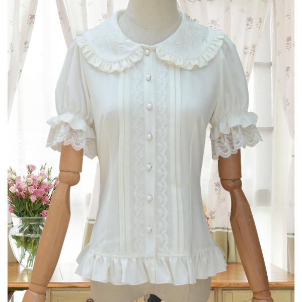 即納 ロリータ Lolita ブラウス レディース シャツ 夏 人形襟 刺しゅう 半袖 パフスリーブ かわいい 清楚 ホワイト