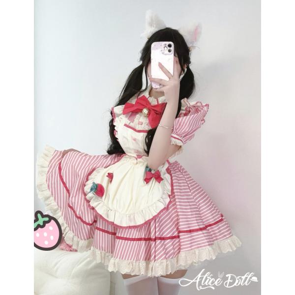 メイド服 ワンピース エプロン セット 半袖 レース フリル 甘ロリ いちご ストライプ レディース 甘かわいい ミニ丈 コスプレ 衣装