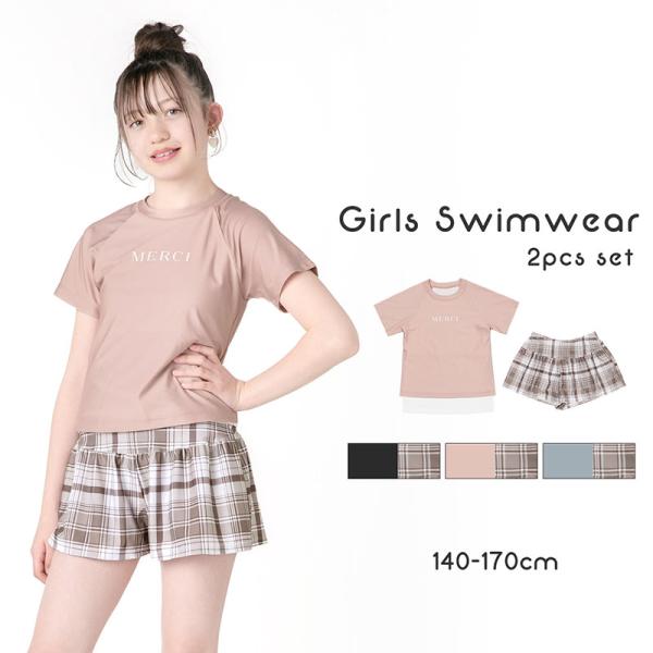 ジュニア 水着 女の子 キッズ セパレート インナー付 半袖 キュロット ティーン 小学生 中学生 ラッシュ 可愛い 140 150 160 170 おしゃれ セット