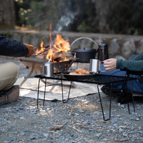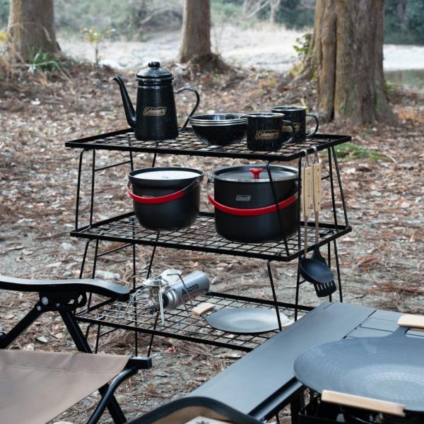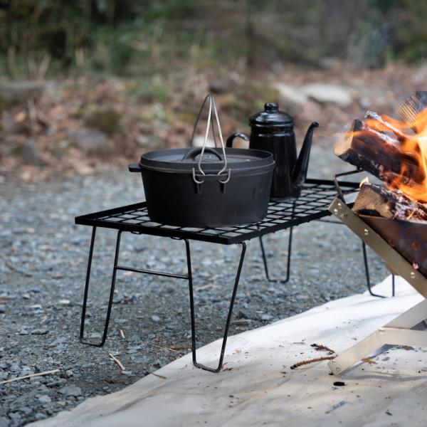 ◇スチール製なので鍋やフライパン等の熱のある物を置いても安心なアウトドアラック。