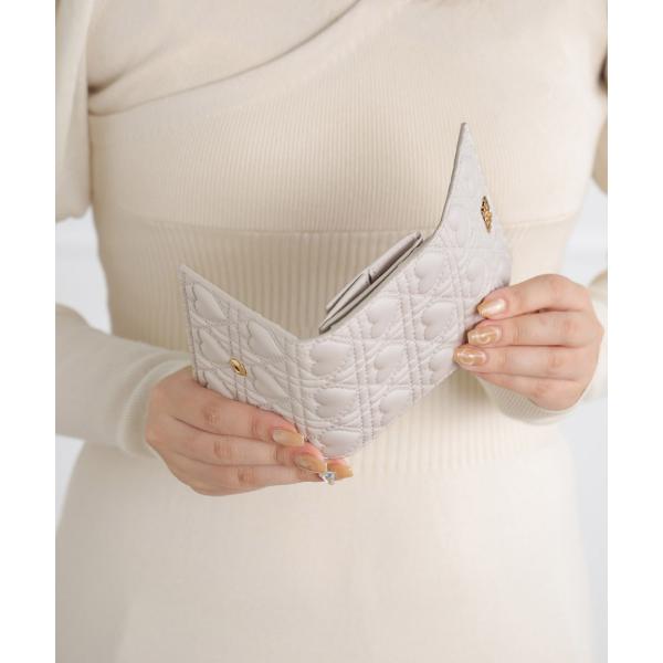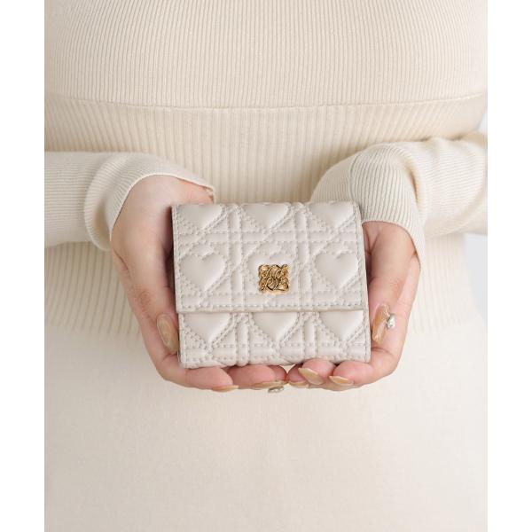 ・ハートのキルティング柄が可愛い三つ折り財布。・ぷっくりデザインがポイント◎・内側の小銭入れは、見やすく取り出しやすいボックス型。・縦からも横からも出し入れできる札入れで、支払いもスマート。・内側のカードポケットは7つあり、見た目以上の収納力もポイント。・片手に収まるちょうどイイサイズ感で、小さめのバッグにもぴったり。