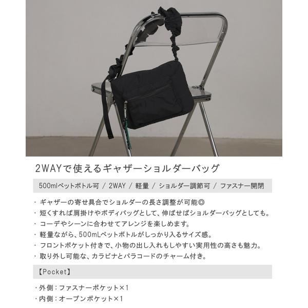 ・ギャザーの寄せ具合でショルダーの長さ調整が可能◎・寄せて短くすれば肩掛けバックとして。伸ばせばショルダーバッグとして使える2WAY仕様。・コーデやシーンに合わせてアレンジを楽しめます。・軽量ながら、500mLペットボトルがしっかり入るサイズ感。・フロントポケット付きで、スマホや小物の出し入れもしやすい実用性の高さも魅力です。・取り外し可能な、カラビナとパラコードのチャーム付き。【ワード:爆買】