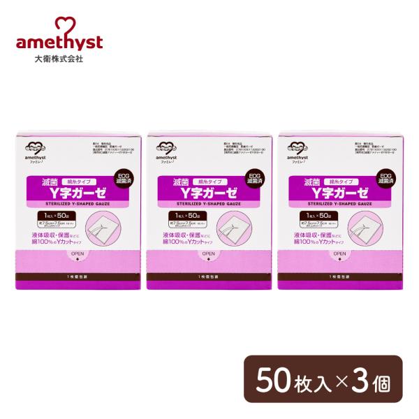 ワンウェイ滅菌Y字ガーゼ(綿糸)7.5×7.5 16ply 50枚入 3個セット アメジスト 大衛