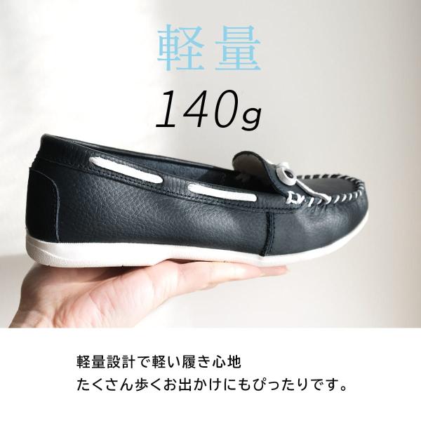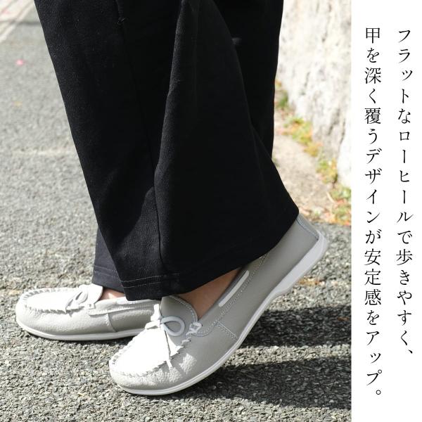 軽量!ソフトな本革使いで柔らかな履き心地のモカシンシューズフラットなローヒールで歩きやすく、甲を深く覆うデザインが安定感をプラス。