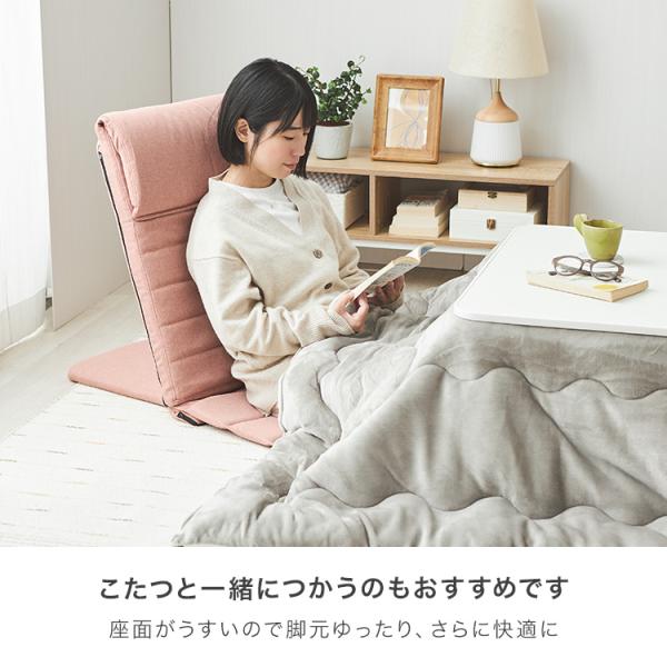 ローテーブルやこたつと一緒に使いやすい座面付き背もたれです。座面が薄いので、ホットカーペットやベッドの上でも使えます