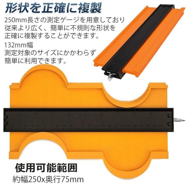 【形状を正確に複製】250mm長さの測定ゲージを用意しており、従来より広く、簡単に不規則な形状を正確に複製することができます。132mm幅、測定対象のサイズにかかわらず、簡単に利用できます。