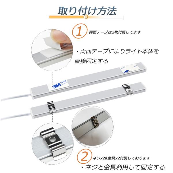 【強力両面テープ/ネジ付き】取り付けには両面テープやネジ提供します、金属、プラスチック、材木、ガラスなどいろんな場所にぴったり吸着することができます。好きな場所にバーライトを簡単に装着できます。